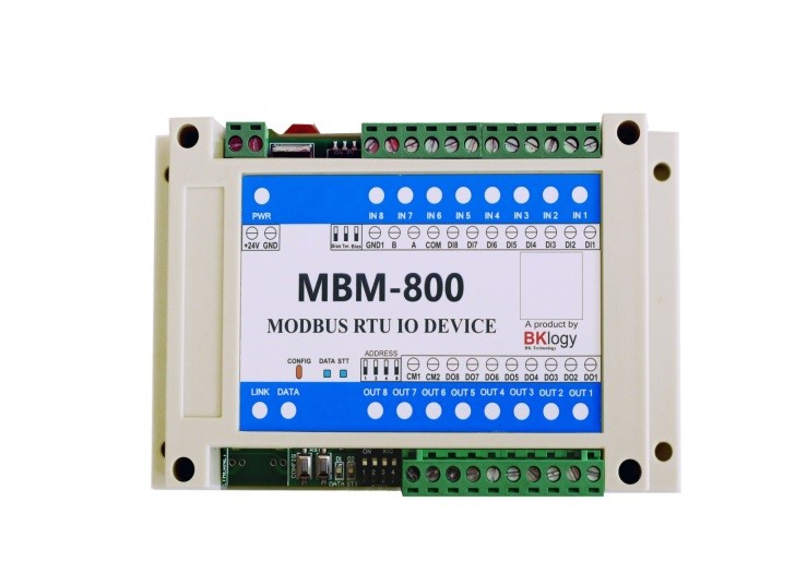MBM-800 là một bộ điều khiển IO, mở rộng IO có thể giao tiếp với bất kỳ PLC hoặc PC nào sử dụng giao thức Modbus RTU.